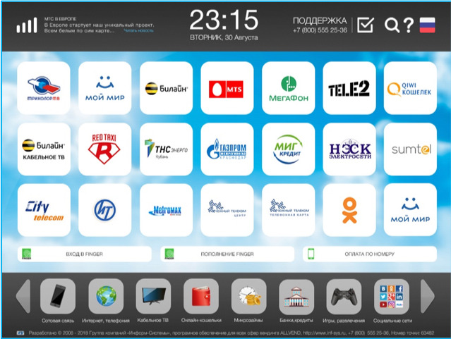| Описание: | ALLVEND – универсальное программное обеспечение для систем самообслуживания. ПО ALLVEND позволяет организовать самообслуживание «под ключ» во многих сферах торговли и услуг в течение 1 недели. Возможности: 1. Автоматизация заказа и оплаты товаров 2. Автоматизация оплаты услуг 3. Автоматизация обслуживания в точках продаж 4. Автоматизация обслуживания в государственных учреждениях 5. Онлайн-информирование клиентов 6. Предоставление справочной информации 7. Автоматизация на заправках 8. Автоматизация платных парковок 9. Автоматизация вокзалов и аэропортов Преимущества: 1. Встраиваемая операционная система 2. Единое ПО для разных типов устройств 3. Широкий спектр функций 4. Поддержка широкого спектра оборудования 5. Запуск киосков в работу за 15 минут 6. Полное удаленное управление 7. 5 степеней криптозащиты 8. Система бинарных обновлений Ознакомиться с подробной информацией о возможностях ПО ALLVEND, презентацией и дополнительными материалами Вы можете на сайте ГК «Информ-Системы» (http://inf-sys.ru/) в разделе Продукты, по телефону +7 (800) 555-25-36, а также связавшись по электронной почте sales@inf-sys.ru |